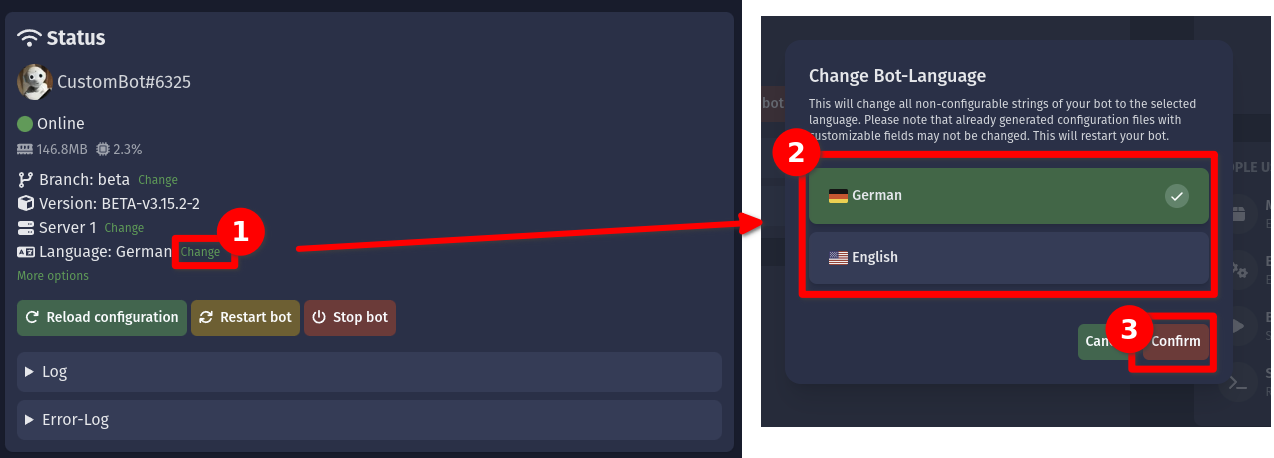 - "Restart bot": This restarts the process of your bot. This might take multiple minutes and involve a high downtime, in which your bot is unreachable. You should only restart your bot if you get asked to do this, are experiencing weird issues or want to apply an update.