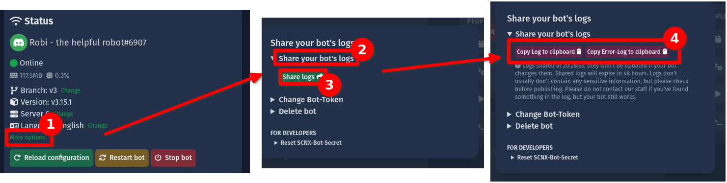 - Click on "Share your bot's logs" and then press the button "Share logs". Your Bot-Host will now upload the logs of your bot to paste.scootkit.net. This might take a few seconds.